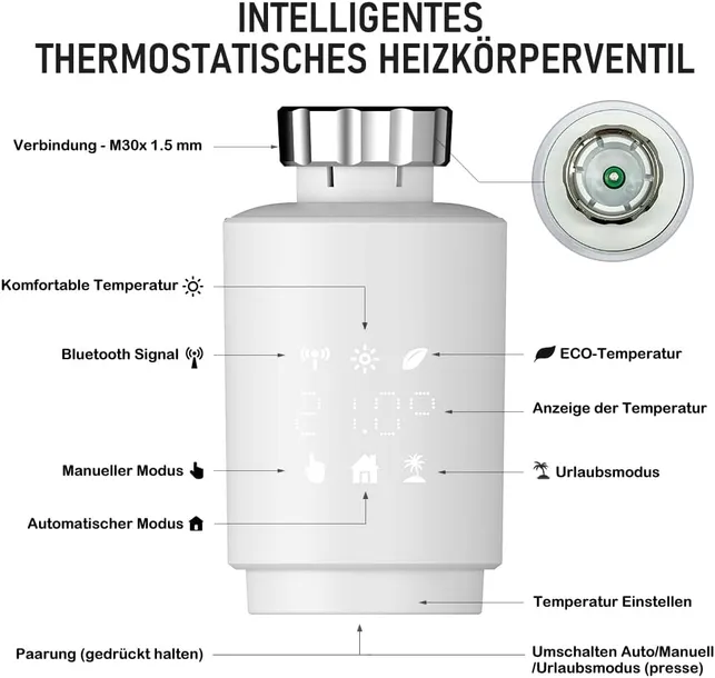 InJolly 3-częściowy inteligentny termostat grzejnikowy Bluetooth ze sterowaniem za pomocą aplikacji Tuya, programowalnym zestawem termostatu cyfrowego, energooszczędnym ogrzewaniem temperaturowym dla M30 x 1,5 mm